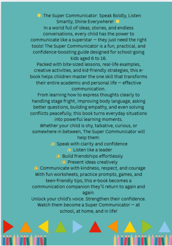 Perfect for kids aged 6–16, this guide combines public speaking skills, creative writing tools, fun exercises, and simple activities that make learning enjoyable and stress-free.